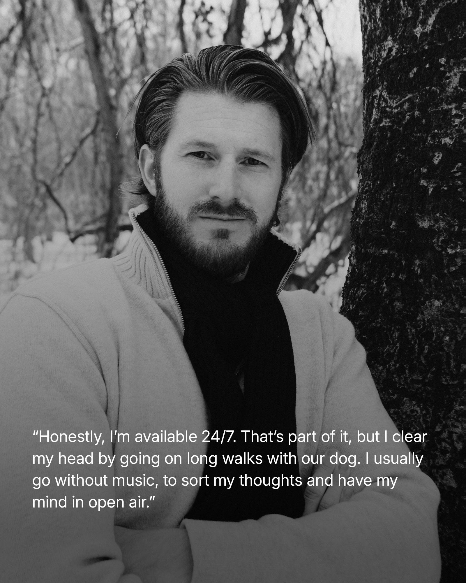 “Honestly, I’m available 24/7. That’s part of it, but I clear my head by going on long walks with our dog. I usually go without music, to sort my thoughts and have my mind in open air.”
